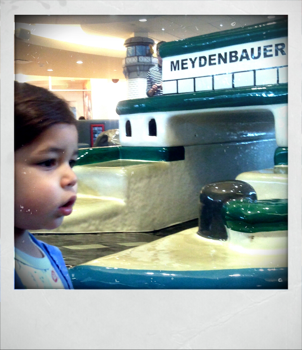 Flash forward some 5 years or so and there we are, my cool kid and me, sizing up the Kids Cove on a rainy Tuesday afternoon. It was as big and colorful as I remembered and now, having joined the mama ranks, I found it even more appealing. There is a bench which surrounds the play area and only one entrance, which makes a possible toddler escape just a little bit harder. The play structures are soft and the floor is padded, with neat little cubbies for shoes lining one wall and built in hand sanitizers. All in all, Kids Cove puts most other mall play areas to shame. I mean, how can you compete with a crawl-thru ferry and sandcastle slide? You just can’t.