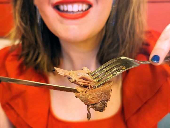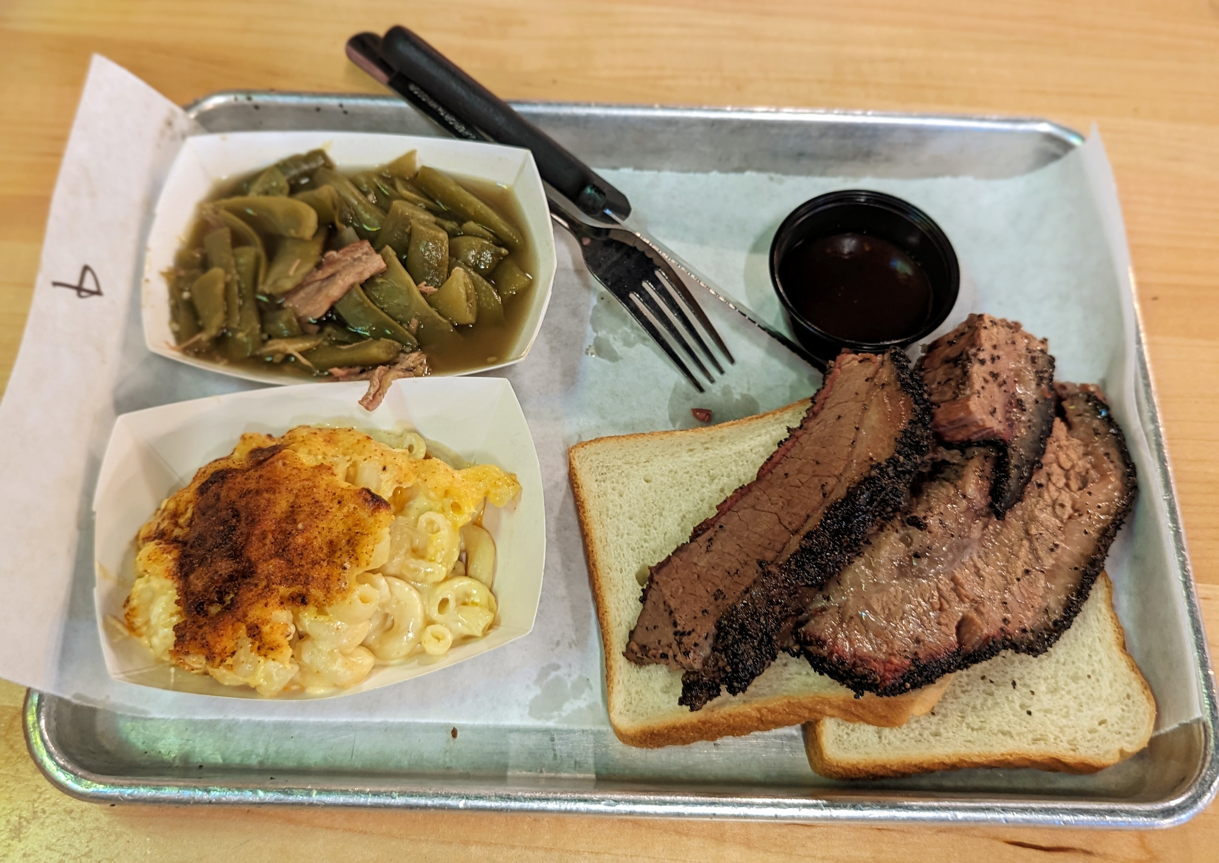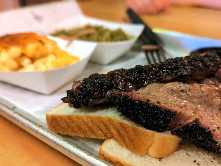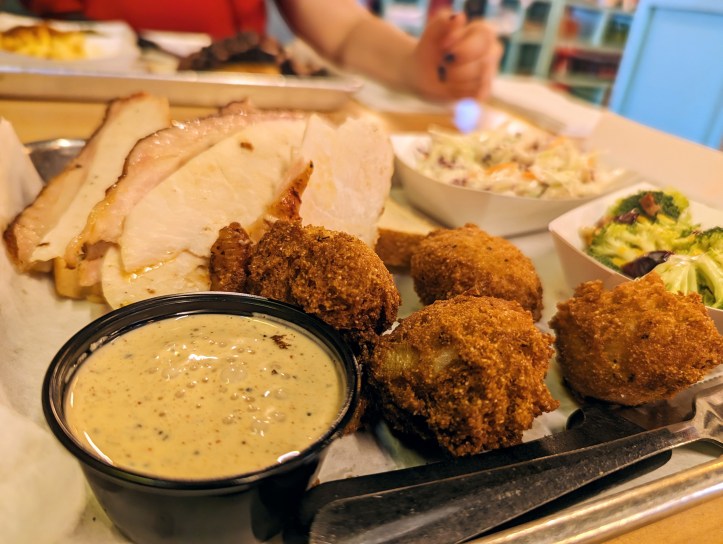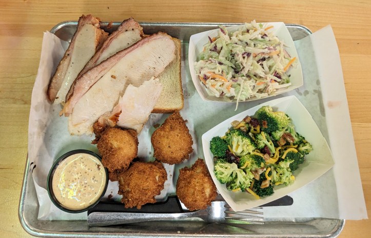 Service was quick and it seemed like mere minutes before our trays, loaded down with food, were plopped in front of us. Aubrey got the brisket of course, because how could she not, and pushing my semi vegetarianism aside, I took a bite or maybe two, because how could I not? It was delicious, smokey and not a bit dry. My smoked turkey was equally lip smackin’ and once we figured out what to do with the Jack’s Creek BBQ sauce; which was to douse nearly everything in it’s spicy vinegary goodness, we were in BBQ heaven.