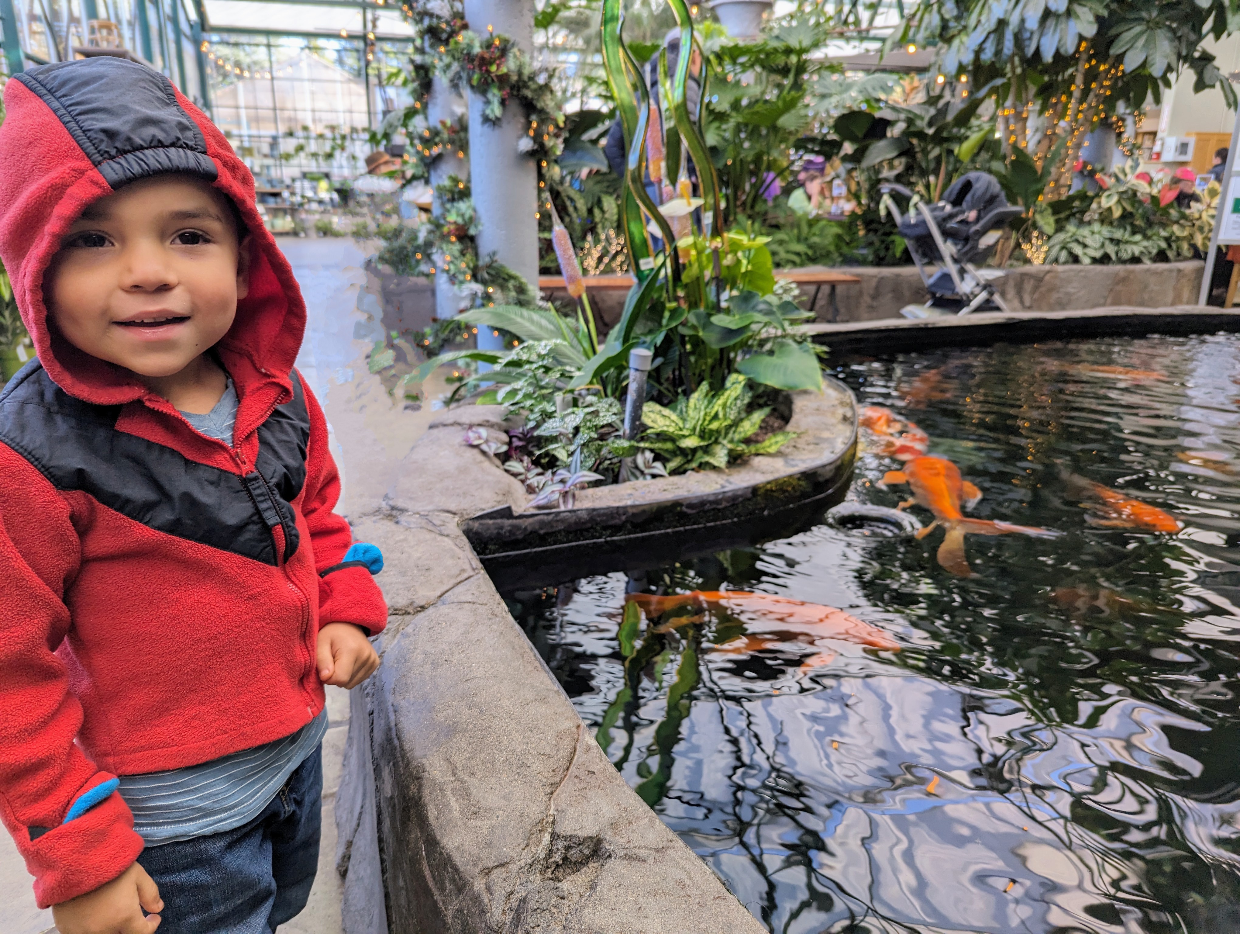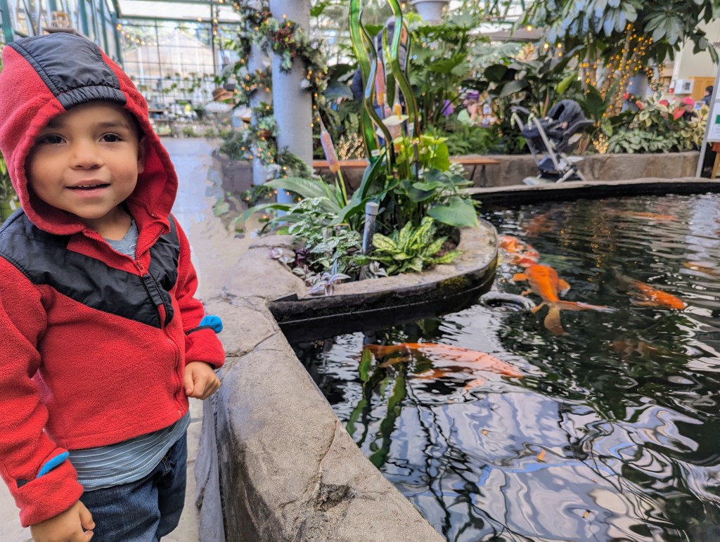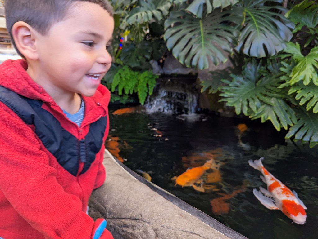 After bidding adiu to ‘ol Humphrey, we headed back to the koi ponds which are in themselves worth a visit alone. There are two ponds situated indoors near the cafe teeming with the largest koi I have ever seen in my life. They were seriously ginormous and I think Rio could have sat there for hours watching them swim around.