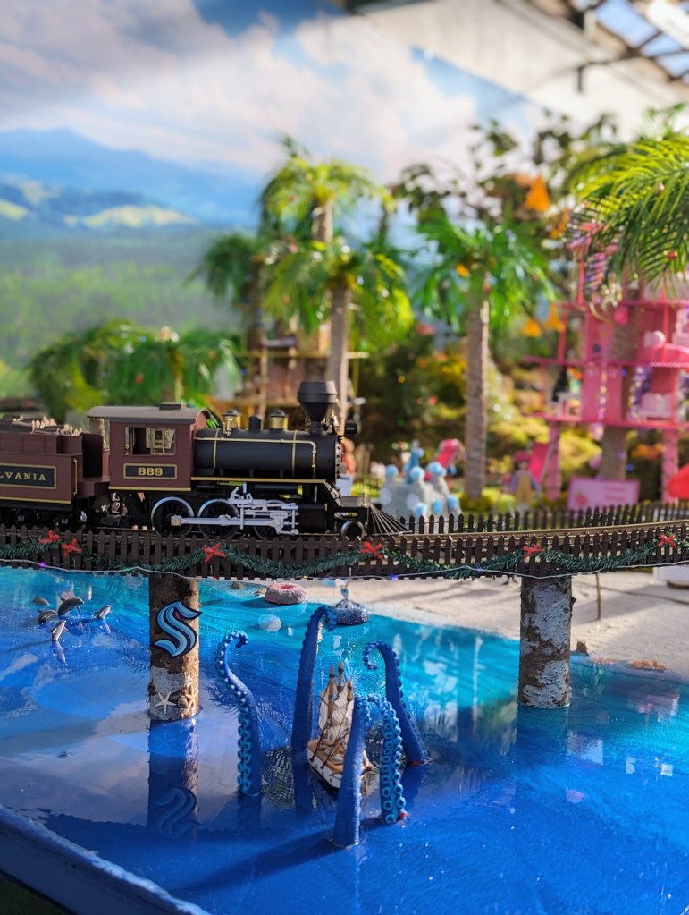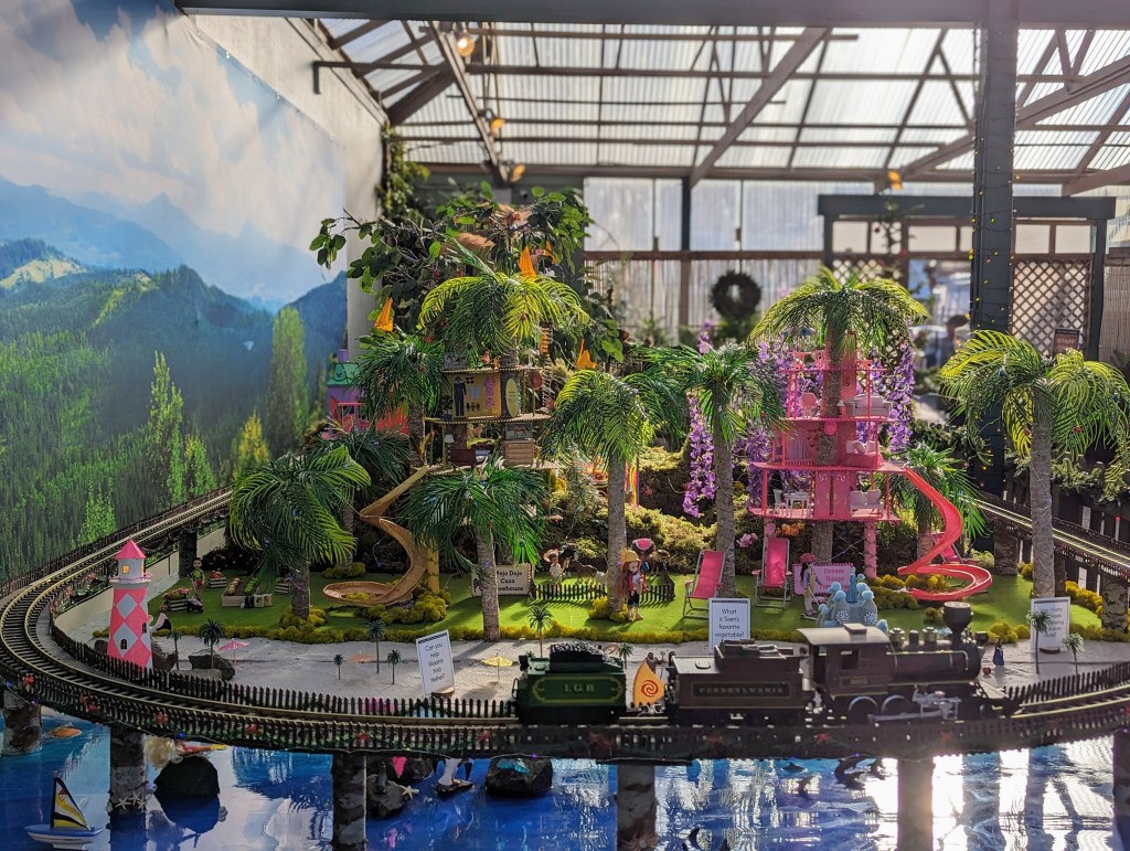 After devouring our breakfast, we headed out to find the piece de resistance, the reason for our seasonal sojourn to Swanson’s that day, the infamous Christmas model train setup. Every year Swansons changes the theme of its train island and though this was my first year actually seeing it in person, I can only imagine that previous years were just as detailed. Treehouses was the theme this year and from Avatar to the Swiss Family Robinson’s to an ornate Ewok village, all the major treehouses in popular lore were covered.