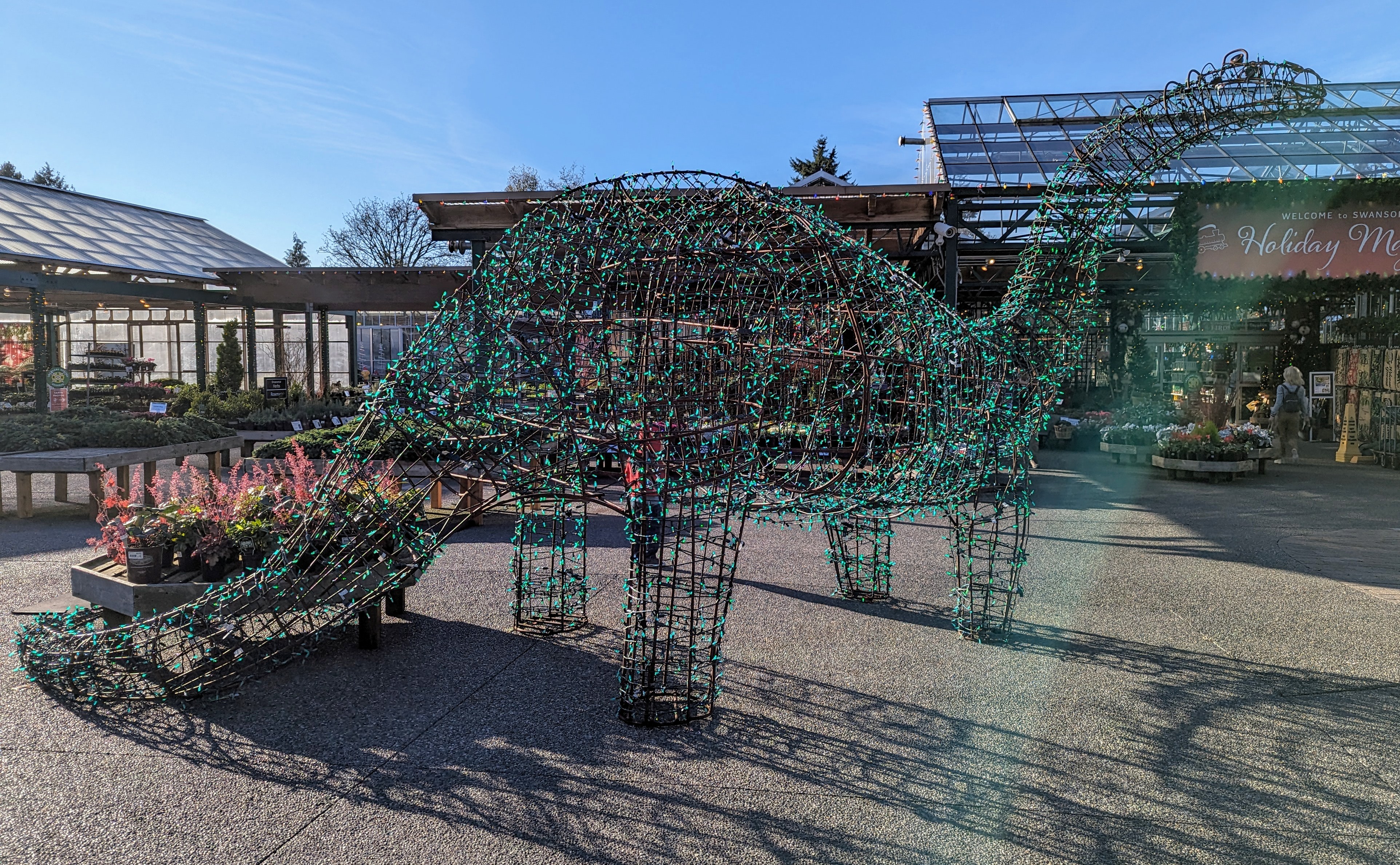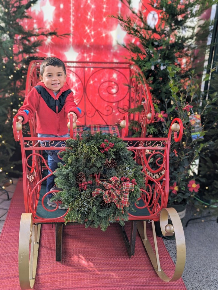 As we headed into the nursery, we were greeted by a tremendous apatosaurus sculpture covered in green lights and though I had to keep Rio from scaling it’s tail, I thought it was the perfect mascot for a gardening store that appeals to all ages. Apparently the Dino’s name is Humphrey and he’s been a Swansons resident since 2016.