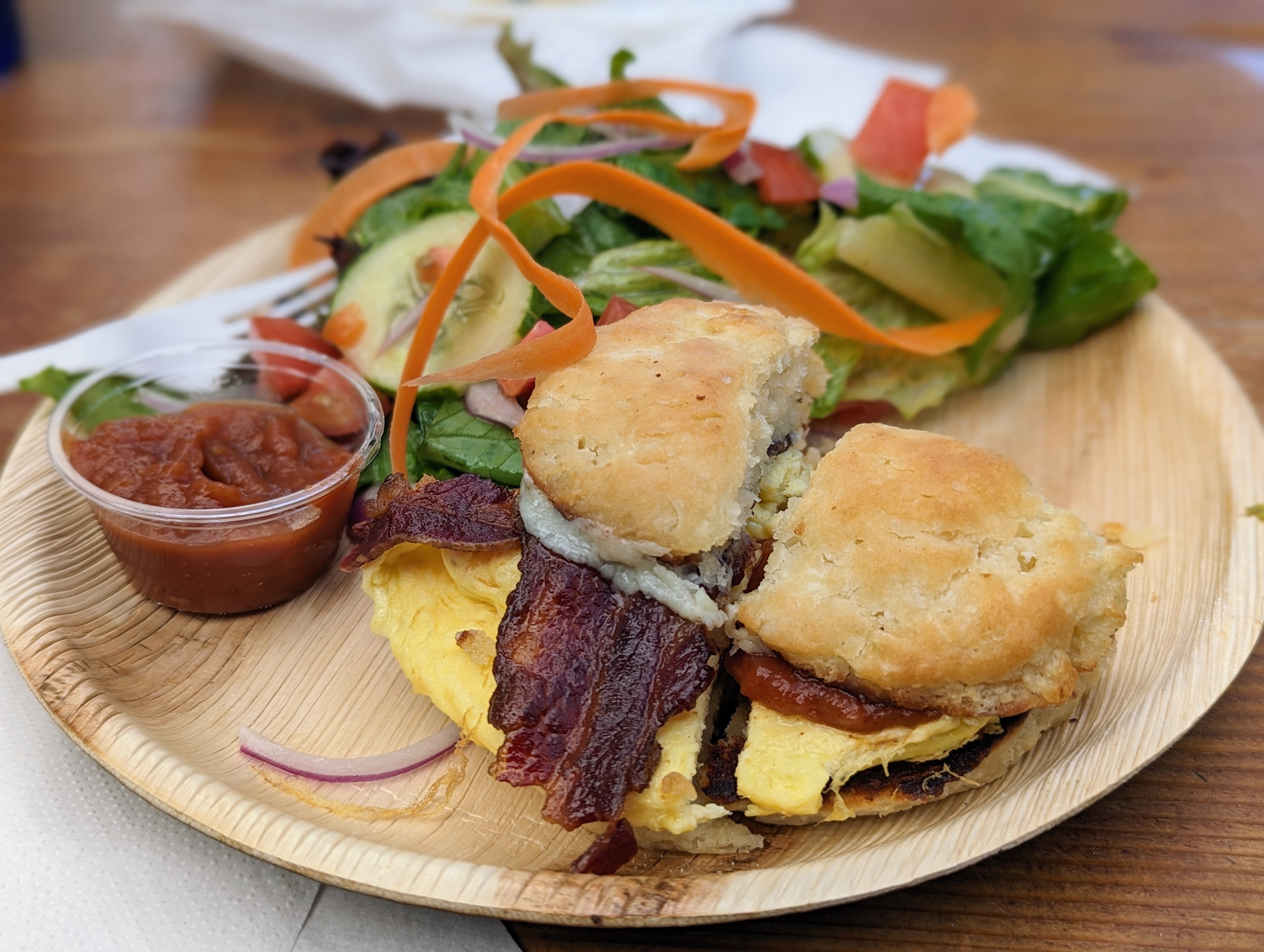 I wasn’t expecting much from the cafe, after all it is located smack in the middle of a gardening center, but I was absolutely stunned by the quality and caliber of the food that emerged from its kitchen. Our breakfast sandwich; bacon, egg and cheese atop a fluffy biscuit with a side of tomato jam, reveled anything to be found in a stand alone cafe elsewhere, and I would return to Swanson’s just for a taste of it again. Especially that tomato jam, which I honestly only got a taste of as Rio quickly laid claim to it. Seriously it was that good and coupled with the fact that you are dining surrounded by giant koi and lush beautiful plants, I felt for a moment as if I was in a tropical paradise somewhere.