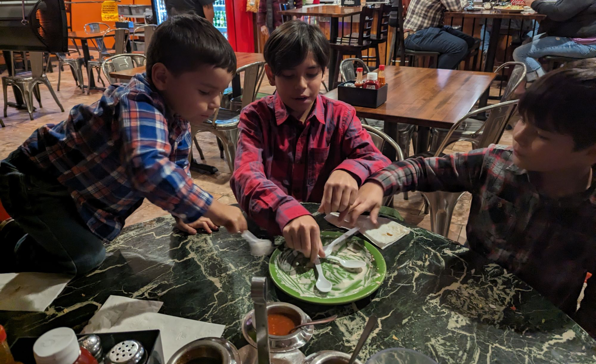 The food was muy delicioso, and soon enough, our plates were empty and our bellies were full. Not full enough though apparently because it wasn’t long before the boys were clamoring for fried ice cream and since they had been moderately behaved thus far, no spilled drinks or dirty looks from fellow diners yet, we acquiesced, one fried ice cream, three spoons.